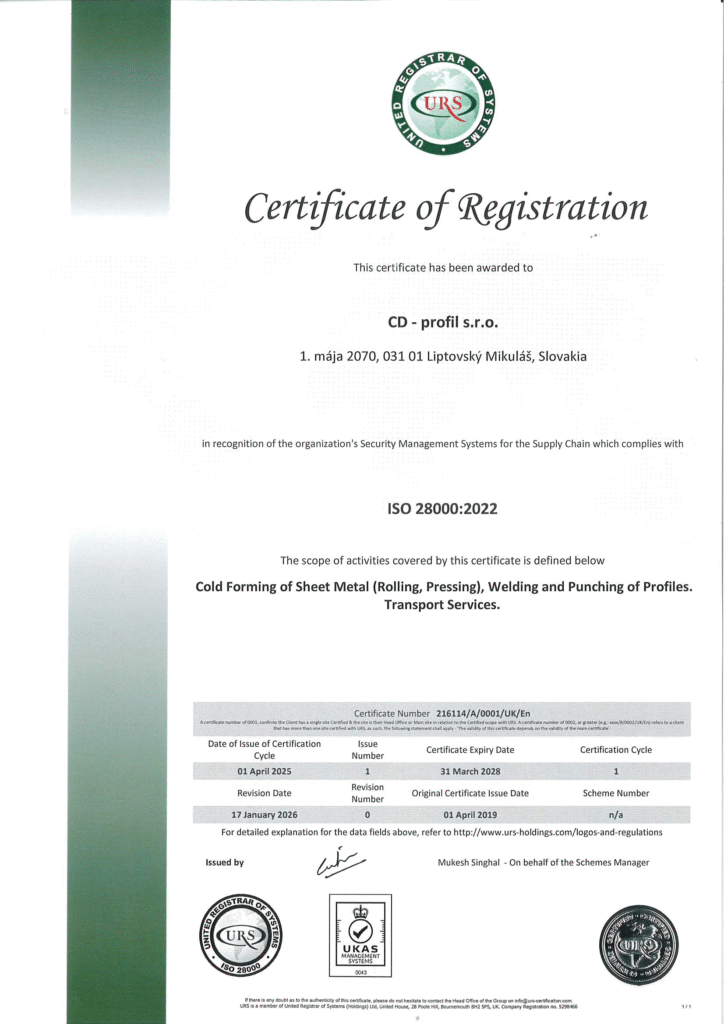 The certification was granted by URS – United Registrar of Systems Czech, s.r.o.