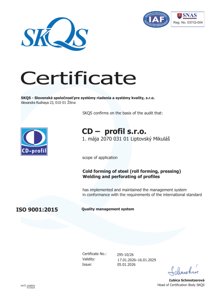 A quality certificate granted by the SKQS – Slovak Association for Management and Quality Systems, s.r.o.