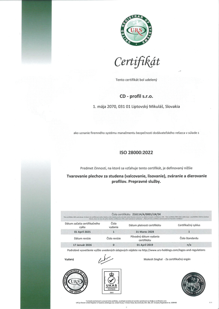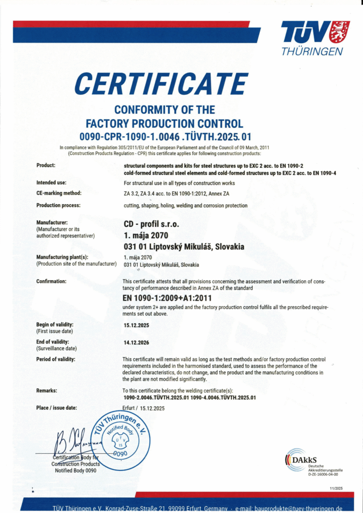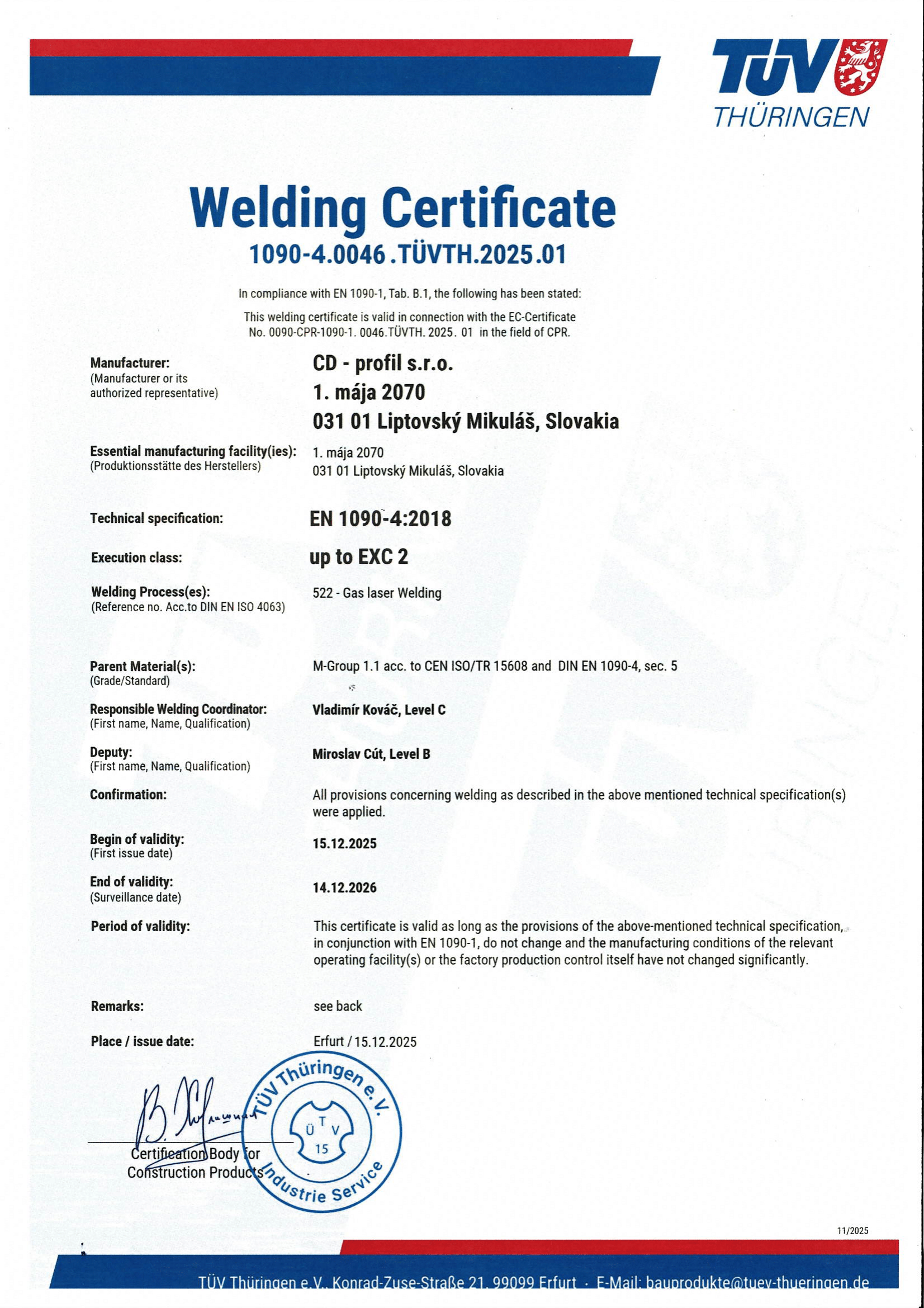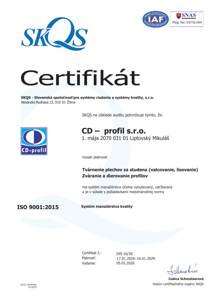 Vďaka dodržiavaniu týchto princípov je spoločnosť CD – profil s.r.o. držiteľom certifikátu podľa ISO 9001:2015, ako aj niekoľkých zahraničných certifikátov.